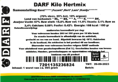 DARF Hert Mix ist ein komplettes KVV-Futter für Ihren Hund. Das bedeutet, dass das Futter neben Reh auch Ente, Kaninchen und Lamm enthält und Sie es daher nach dem BARF-Prinzip füttern.