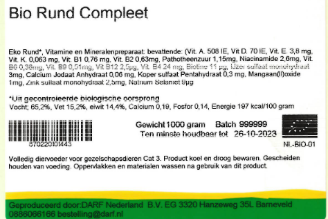 Eko Beef*, Vitamin- und Mineralstoffpräparat: enthält: (Vit. A. 508 IE, Vit D. 70 IE, Vit. E. 3,8 mg, Vit. K. 0,063 mg, Vit. B1 0,76 mg, Vit. B2 0,63 mg , Pathothensäure 1,15 mg, Niacinamid 2,6 mg, Vit. B6 0,38 mg, Vit. B9 0,51 mg, Vit. B4 24 mg, Biotin 11 µg, Eisensulfat-Monohydrat 0,06 mg, Kupfersulfat-Pentahydrat 1 mg, Zink Sulfat-Monohydrat 2,5 mg, Natriumselanit 9 µg
