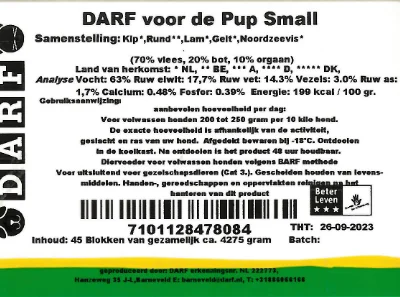 DARF Small Pup ist ein spezielles Welpenfutter im Kleinformat. Von den Rohstoffen her entspricht es dem DARF KVV Welpenfutter. So auch mit Huhn, Rind, Lamm und Ziege, allerdings feiner gemahlen. Allerdings ist die Menge an Kalzium unterschiedlich. Diese Variante enthält 45 Würfel à 95 Gramm.