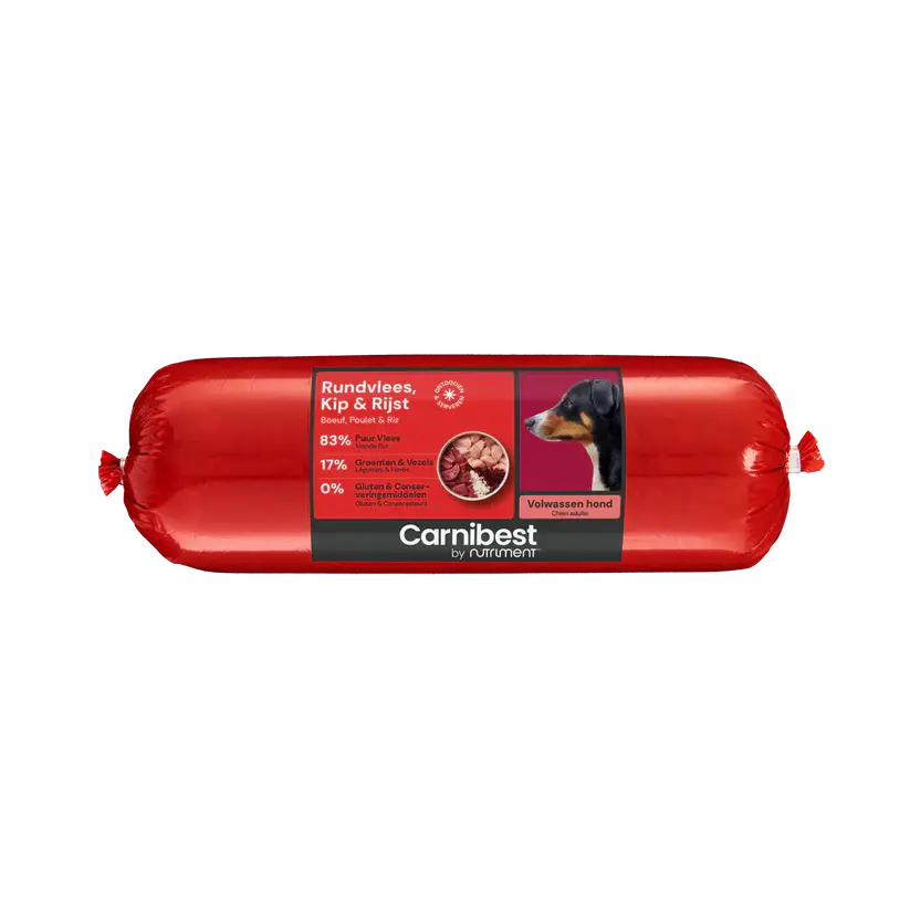 Frisches Fleischfutter von Carnibest aus Rindfleisch, Hühnchen und Reis.