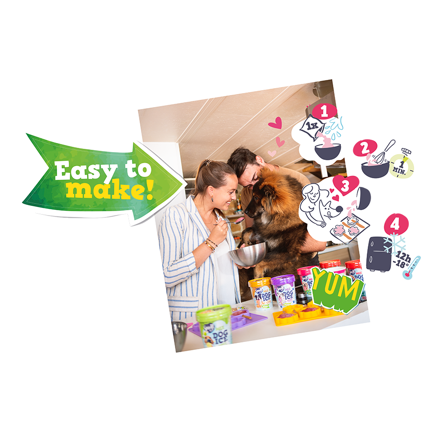 Ergänzungsfuttermittel für Hunde. Gut für +-10 Eiscremes für einen kleinen Hund und +-6 für einen großen Hund. Unter Aufsicht 1 Eis pro Tag essen. 10 essbare Eisstiele im Lieferumfang enthalten.