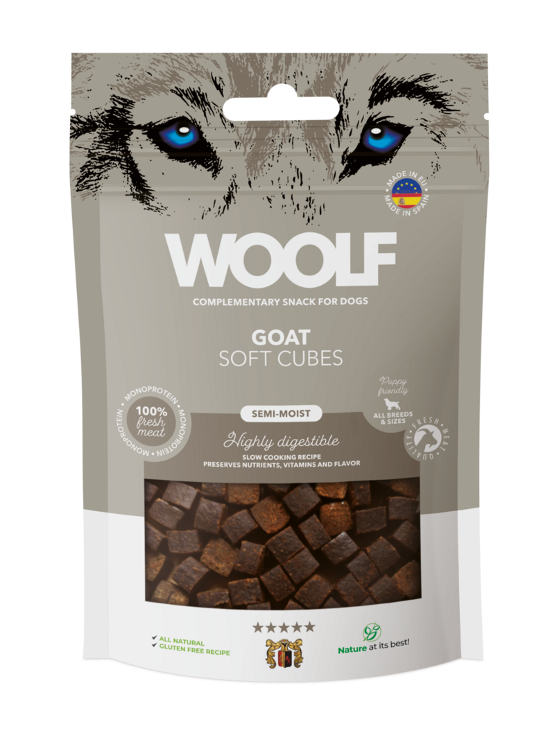 Woolf Soft Cubes sind ein Hundesnack mit einer charakteristischen halbfeuchten Textur, der vollständig aus natürlichen Zutaten hergestellt wird.