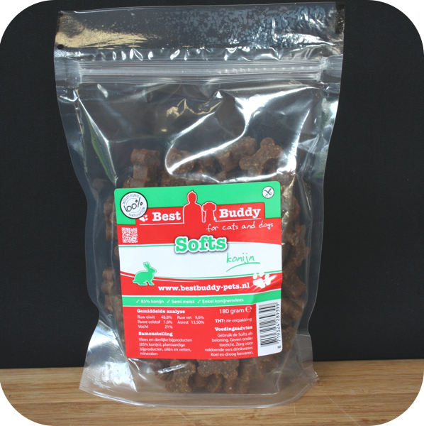 The Softs are THE soft reward snacks in many flavors. Made from no less than 85% meat and meat meal, in contrast to the 4% meat meal that is common in the well-known buckets. These snacks are gluten free and full of flavor. The Softs are suitable as a small snack and especially as a training snack for your dog.