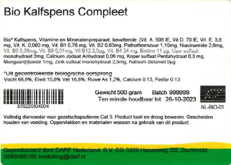 Bio* rumen, Vitamin and Mineral preparation: containing: (Vit. A. 508 IU, Vit D. 70 IU, Vit. E. 3.8 mg, Vit. K. 0.063 mg, Vit. B1 0.76 mg, Vit. B2 0.63mg, Pathothenic acid 1.15mg, Niacinamide 2.6mg, Vit. B6 0.38 mg, Vit. B9 0.51 mg, Vit. B12 2.5 µg, Vit. B4 24 mg, Biotin 11 µg, Iron sulphate monohydrate 3 mg, Zinc sulphate monohydrate 2.5mg, Sodium Selanite 9µg