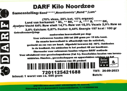 DARF North Sea is a food based on fresh fish and fresh meat. A delicious combination of North Sea fish, beef, duck and lamb. This fish (consisting of coalfish, cod, redfish and whiting) contains a lot of vitamin D, Omega 3 and Omega 6. Advice is to alternate with this regularly.