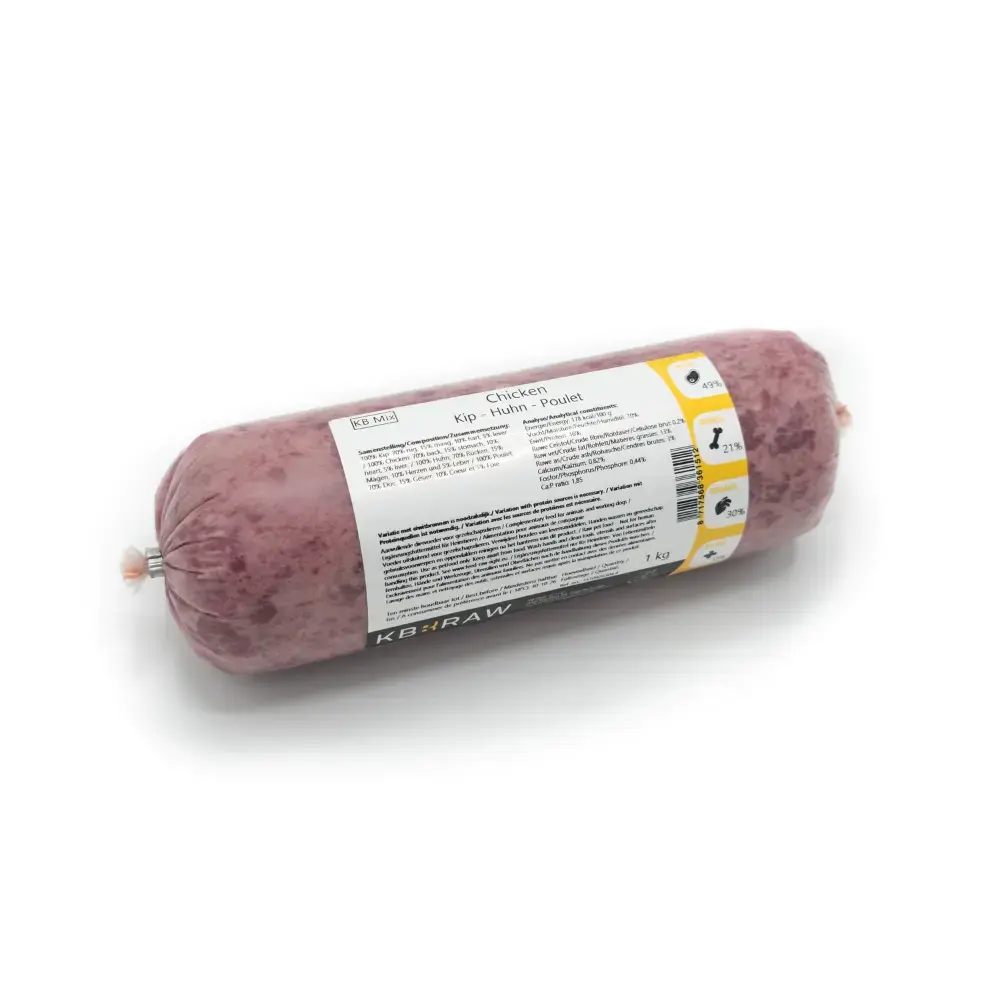 This KB Mix only contains chicken as a protein source, which is generally easy to digest. It contains only natural ingredients, without artificial additives. This mix is not complete in itself, variation is needed for a balanced menu.