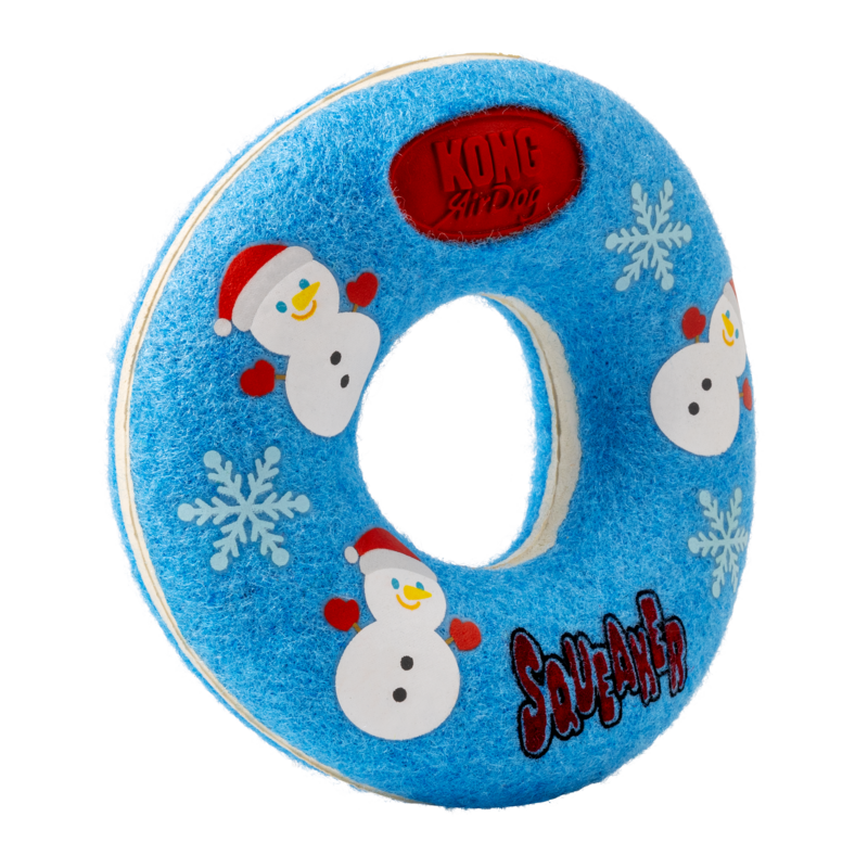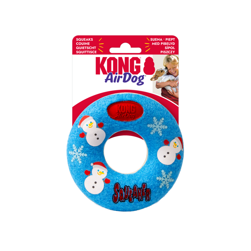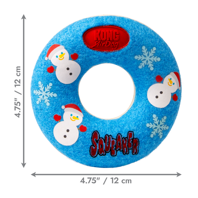 The KONG Holiday Airdog Donut is a fun dog fetch toy that combines two favorites: the tennis ball and the squeaker.