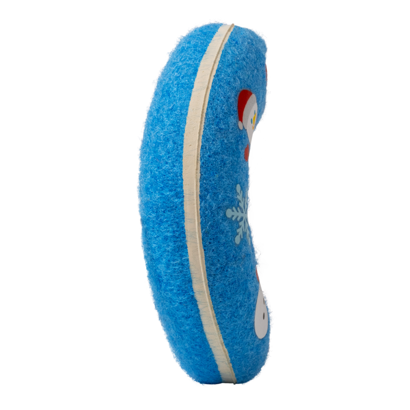 The KONG Holiday Airdog Donut is a fun dog fetch toy that combines two favorites: a tennis ball and a squeaker. Made with special, non-abrasive KONG tennis ball material, this donut is gentler on teeth and gums than standard tennis ball felt. The built-in squeaker encourages playtime, while the dynamic bounce and roll action provides endless hours of fetch. A convenient hole in the center makes the donut easy for both dog and owner to grasp, perfect for interactive play sessions during the holidays.