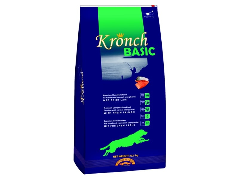 Kronch Basic is a tasteful, complete premium dog food based on fresh Norwegian salmon. It is suitable for adult dogs of all dog breeds with a normal energy requirement.
