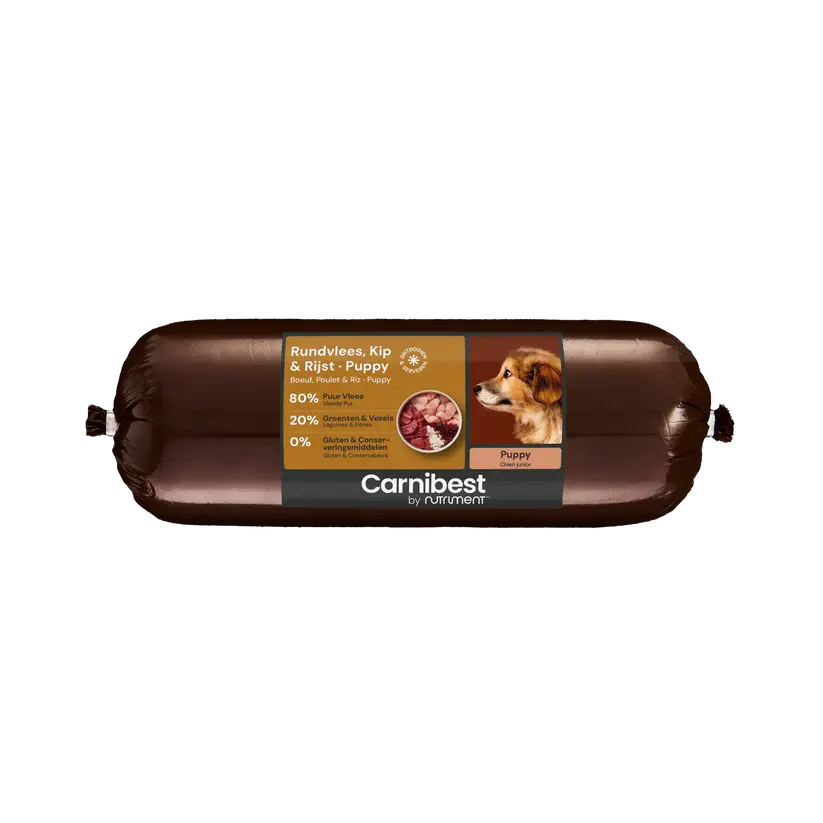 Fresh meat food from carnibest for puppies, made with beef, chicken & rice