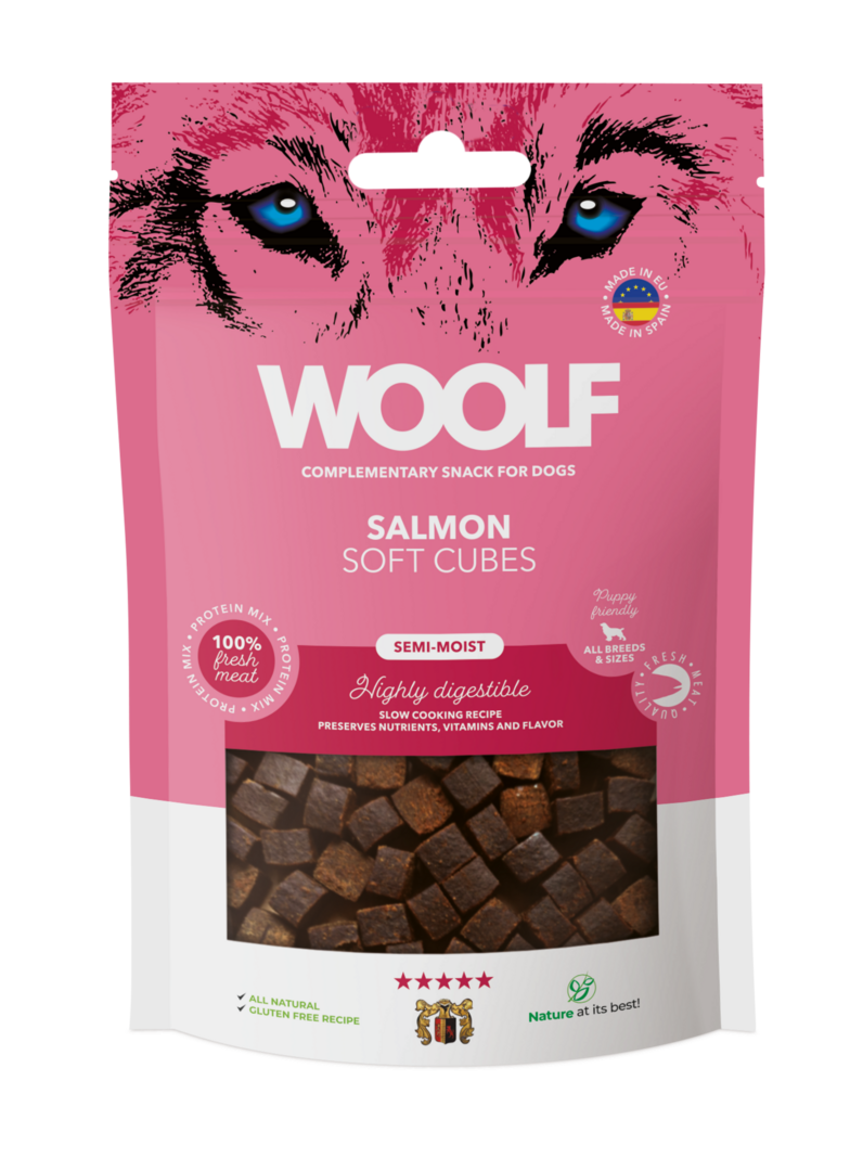 Woolf Soft Cubes are a dog snack with a characteristic semi-moist texture, made entirely from natural ingredients.
