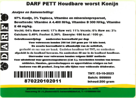 97% Konijn, 3% Tapioca, Vitamine en mineralenpreparaat, Bevattende: Vitamine A 4.400 IU/kg, Vitamine D 300 IU/kg, Vitamine E 48 mg/kg.