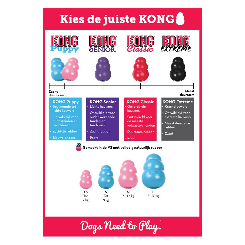 Het Puppy KONG hondenspeeltje is aangepast aan de babytanden van een groeiende puppy. De unieke, volledig natuurlijke rubberformule is de zachtste in de KONG-rubberen speelgoedlijn. Het is ontworpen om te voldoen aan de behoeften van de 28-babytanden van een puppy, en helpt bij het leren van het juiste kauwgedrag terwijl het verrijking biedt en voldoet aan de instinctieve behoeften van een jongere pup, terwijl de grillige stuitering het ideaal maakt voor die pups die gewoon willen spelen. Een gevulde Puppy KONG houdt drukke kleintjes bezig terwijl het de baasjes de vrijheid biedt om aan hun unieke behoeften te voldoen. Wilt u de zindelijkheidstraining gemakkelijker maken of de speeltijd verlengen? Zorg ervoor dat u het speeltje vult met puppybrokjes en een scheutje pindakaas. Voor meer speelplezier, voeg KONG Puppy Snacks toe met KONG Puppy Easy Treat.