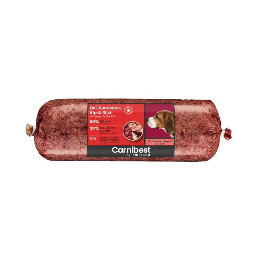 Biologisch vers vlees voeding van carnibest, gemaakt van rund, kip en rijst.